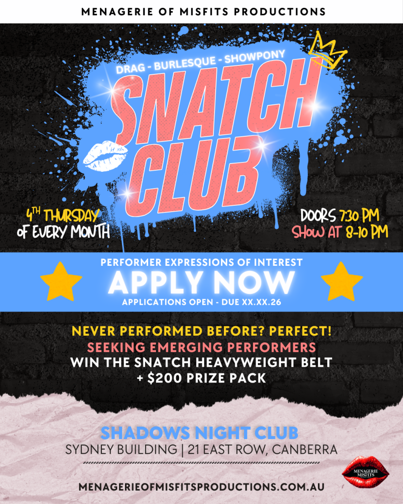 Snatch Club is a low-stakes, high-voltage showpony hoedown where performers step into the ring at Shadows Bar Canberra and slay in front of a loud, loving, fully hyped crowd.